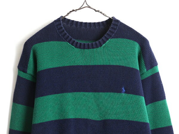 90s ■ POLO ポロ ラルフローレン クルーネック 2トーン ボーダー 長袖 コットン ニット セーター ( 男性 メンズ L 程) ワンポイント 紺 緑| 中古 ラルフ RALPH LAUREN グリーン ネイビー ボーダー柄 ワンポイント ポニー 刺繍 長袖ニット 長袖セーター 90年代 プルオーバー